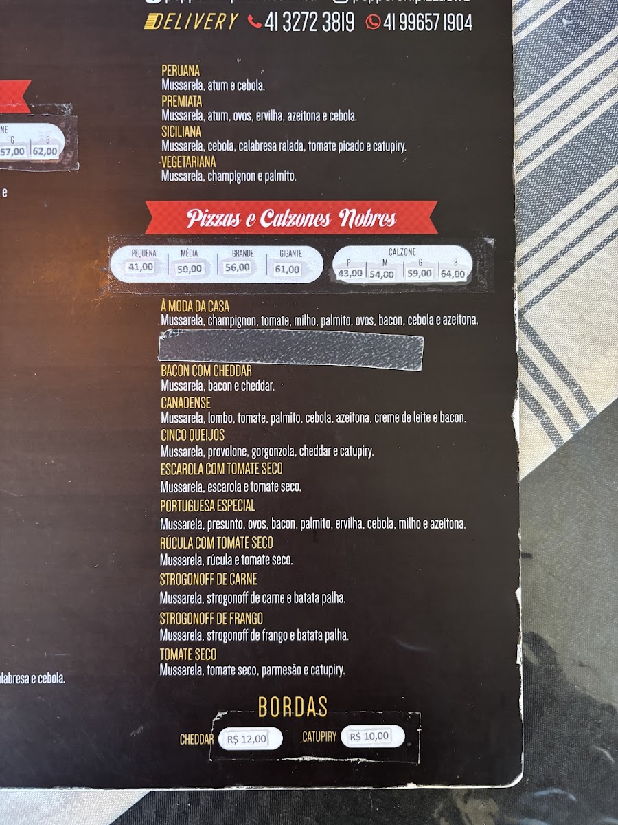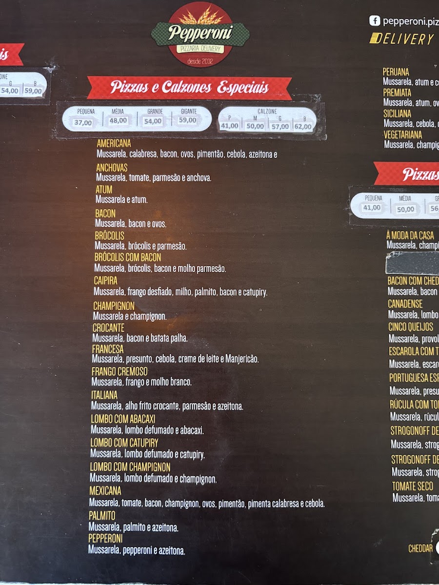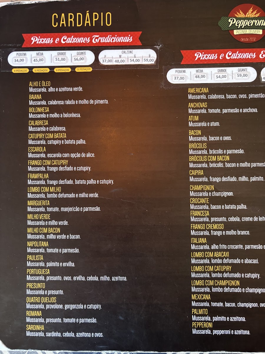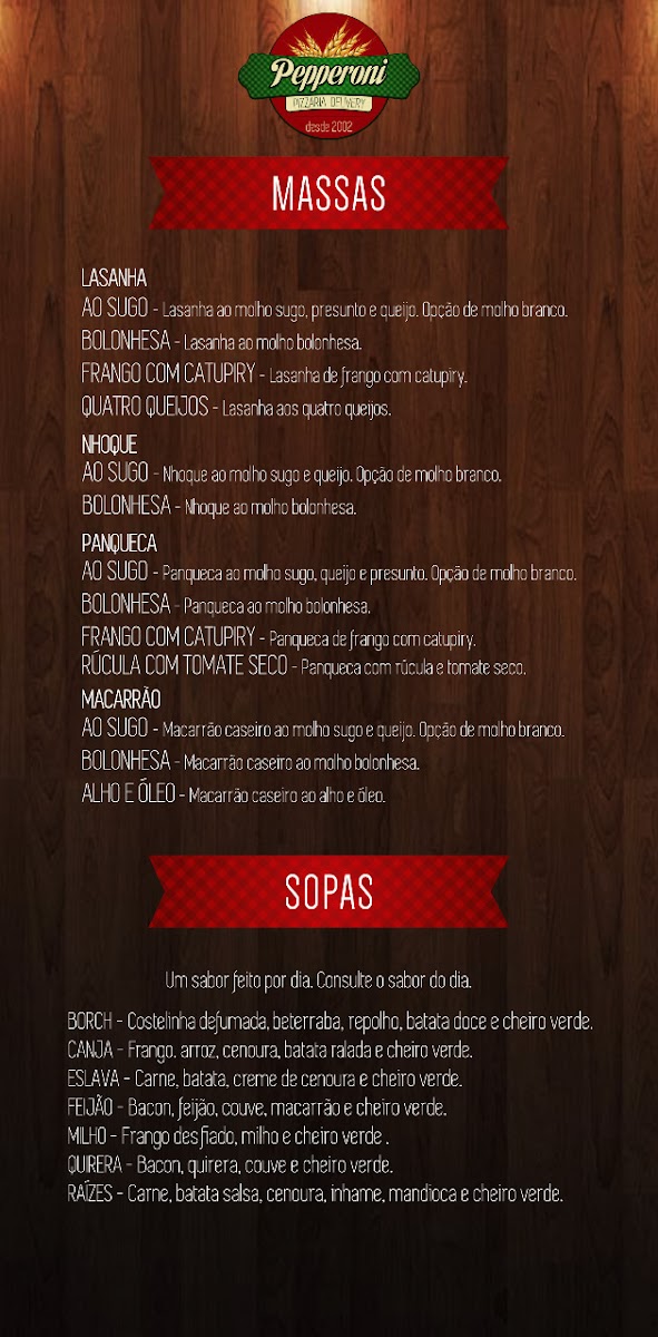 From a reviewer’s perspective, the menu at Pizzaria Pepperoni offers a straightforward but satisfying selection centered on classic Italian comfort food and refreshing drinks. The pizza lineup includes size options such as Pequena, Média, and GrandeBig, as well as stuffed crust versions under Pizzas com Borda in the same sizes, giving customers flexible portion choices. For those who prefer folded pizza, the calzone selection features Calzone - Pequeno, Calzone - Médio, Calzone - Grande, and Calzone - Big, while pasta lovers can choose between Massa 1kg and Massa 500g. The menu also includes lighter options like Porção De Massinha, Sopas 1Lt, and Sopas 500ml. To accompany the meals, there is a variety of beverages such as Água Com Gás 500ml, Água Sem Gás 500ml, Água Tônica Lata 350ml, Chá Mate Leao Pessego 1,5L, and Chá Mate Leao Pessego 450ml, along with juices like Suco De Morango, Limonada Suiça, Suco De Laranja, Suco De Abacaxi, and Suco De Maracuja. Additional items such as Embalagem Para Viagem are available for takeaway convenience. Overall, the menu is simple, focused, and well-suited for those looking for pizzas, calzones, pasta, and casual drinks in generous size options.