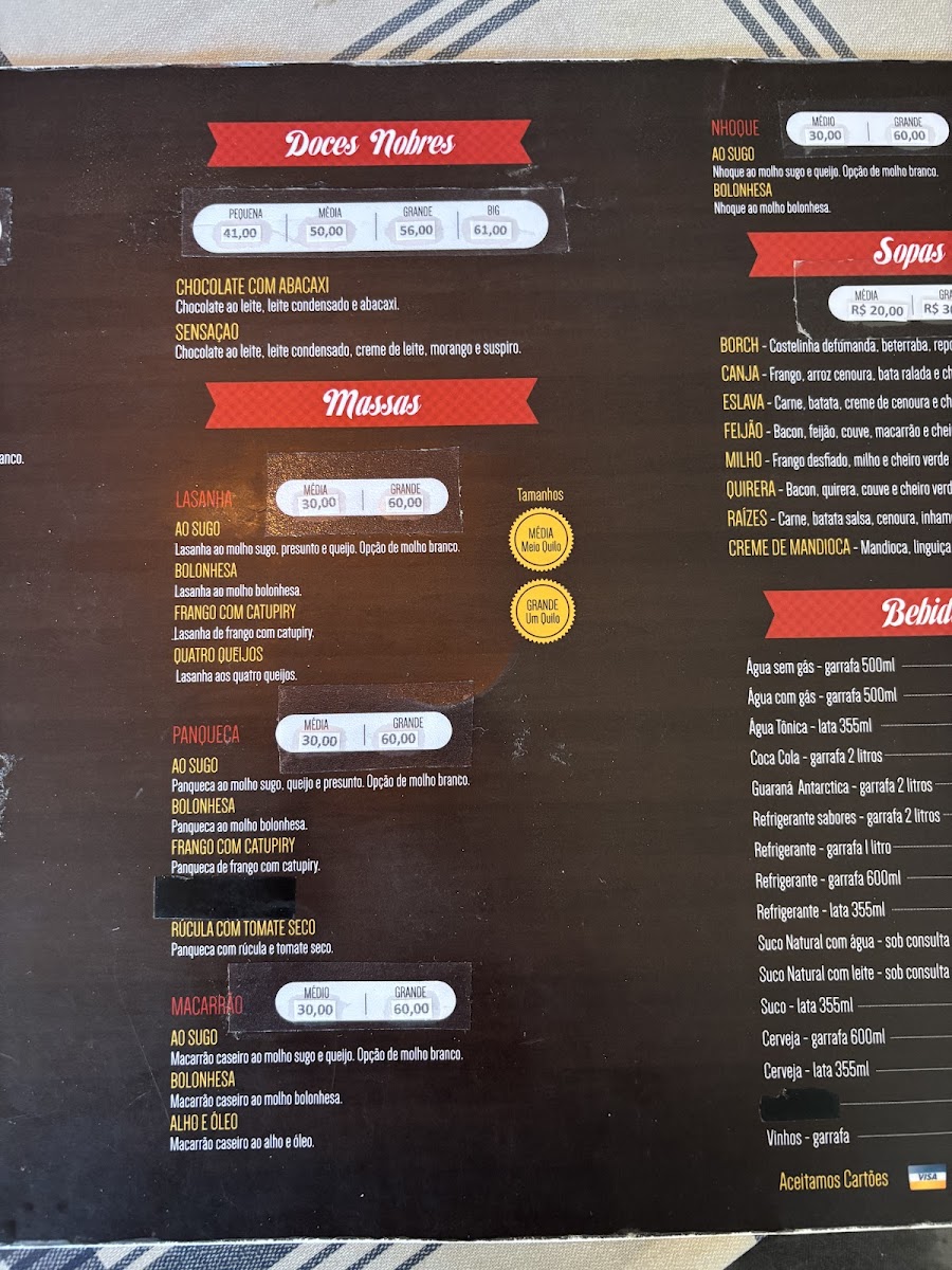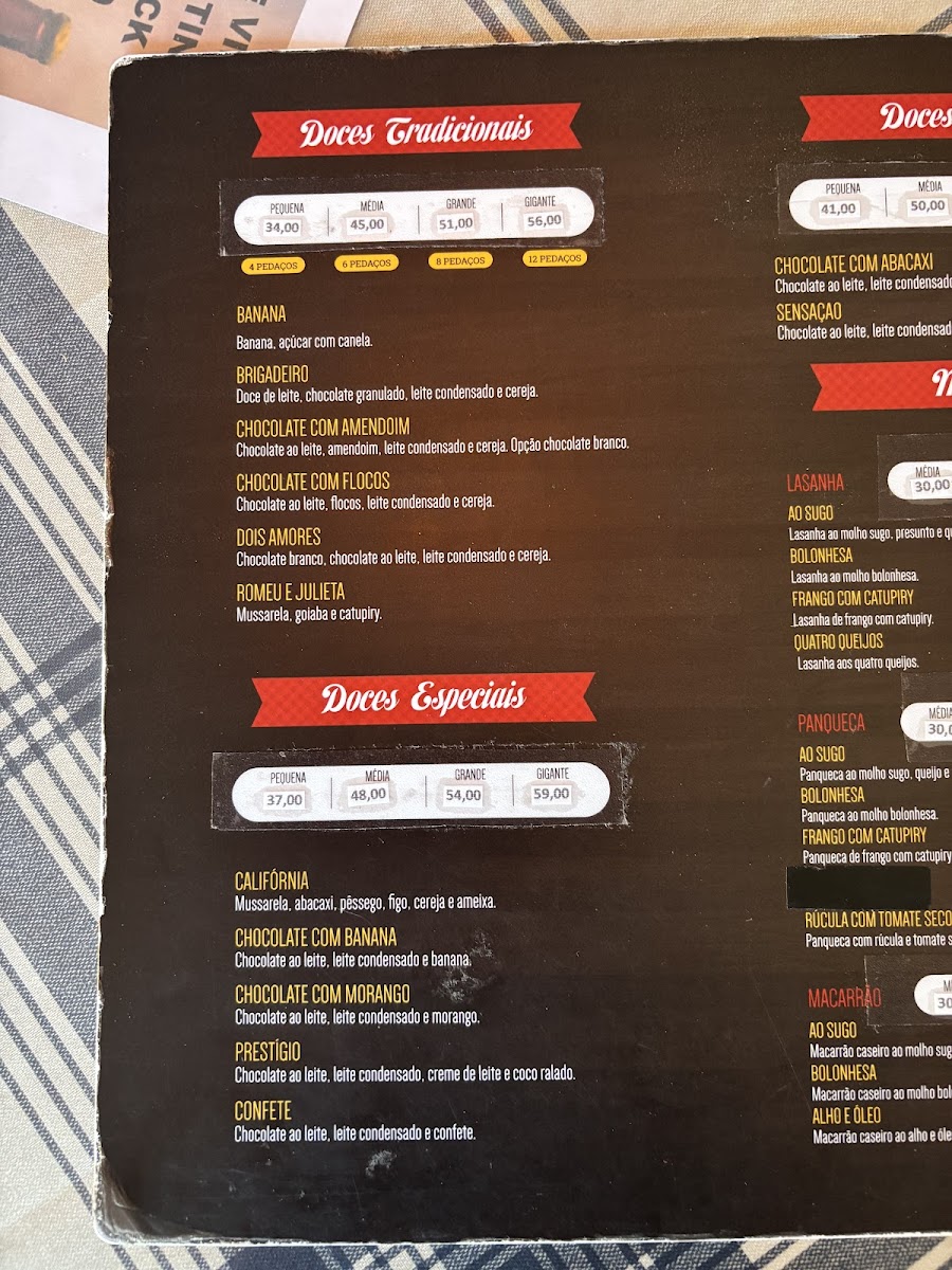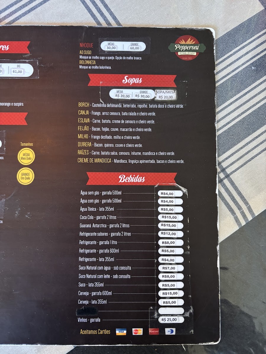From a reviewer’s perspective, the menu at Pizzaria Pepperoni offers a straightforward but satisfying selection centered on classic Italian comfort food and refreshing drinks. The pizza lineup includes size options such as Pequena, Média, and GrandeBig, as well as stuffed crust versions under Pizzas com Borda in the same sizes, giving customers flexible portion choices. For those who prefer folded pizza, the calzone selection features Calzone - Pequeno, Calzone - Médio, Calzone - Grande, and Calzone - Big, while pasta lovers can choose between Massa 1kg and Massa 500g. The menu also includes lighter options like Porção De Massinha, Sopas 1Lt, and Sopas 500ml. To accompany the meals, there is a variety of beverages such as Água Com Gás 500ml, Água Sem Gás 500ml, Água Tônica Lata 350ml, Chá Mate Leao Pessego 1,5L, and Chá Mate Leao Pessego 450ml, along with juices like Suco De Morango, Limonada Suiça, Suco De Laranja, Suco De Abacaxi, and Suco De Maracuja. Additional items such as Embalagem Para Viagem are available for takeaway convenience. Overall, the menu is simple, focused, and well-suited for those looking for pizzas, calzones, pasta, and casual drinks in generous size options.